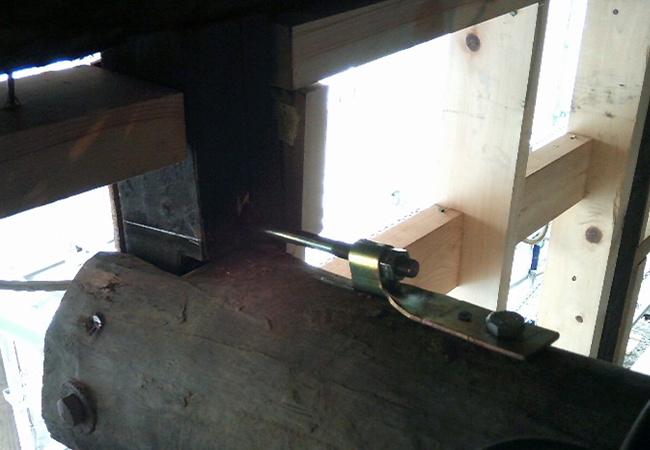 既設の梁に羽子板ボルトを施工して柱と緊結しました