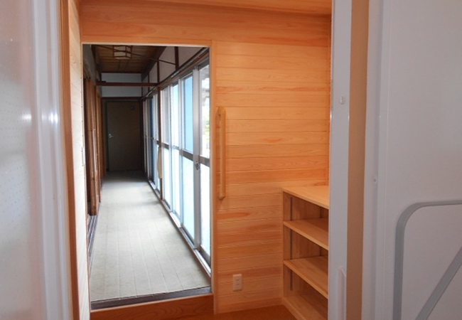 洗面所の仕上げに羽目板(ヒノキ)を使用した例