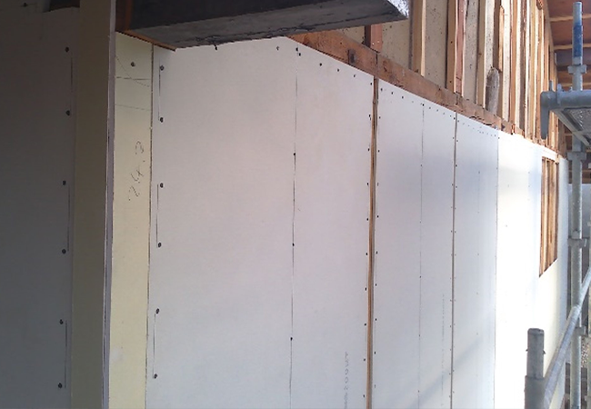 天井組み、断熱材敷き、気密シートを張り終えたらプラスターボードを張っていきます。