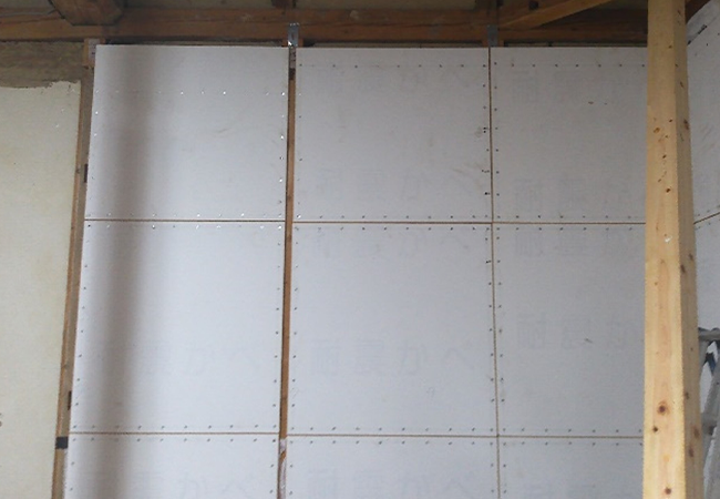 耐震補強工事では外壁下地面材にはニチハ社製のかべ強化、内壁下地面材には大建工業社製のかべ大将を使用して耐震等級3の仕様にしました。