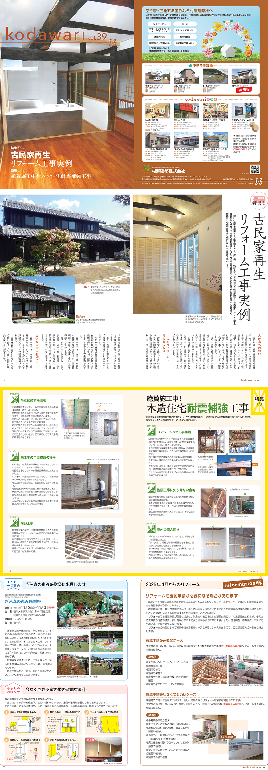 今回は古民家リフォームの特集や現在工事中の耐震リノベーションの様子、来年4月からのリフォームで確認申請が必要なケースの一例のご紹介、11/2(土)にメモリアルセンターで開催される「ぎふ森の恵み」に出展するご案内などを掲載しています。