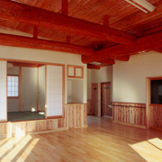 接骨院に隣接する老人福祉施設です。自然素材を使用して明るく利用しやすいようにとのコンセプトでしたので、岐阜県産材の長良杉を天井、腰板に使用して梁に柿渋を塗り自然素材を使用し、天井付近にある採光排煙窓により太陽光を取り入れ、明るく木の香りがする施設になりました。