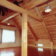 山小屋風の建物でポストアンドビーム工法で行い、壁材には北欧材パイン材と梁には米松材を使用しログハウス調に仕上げました。