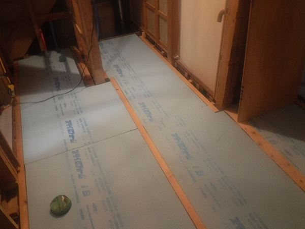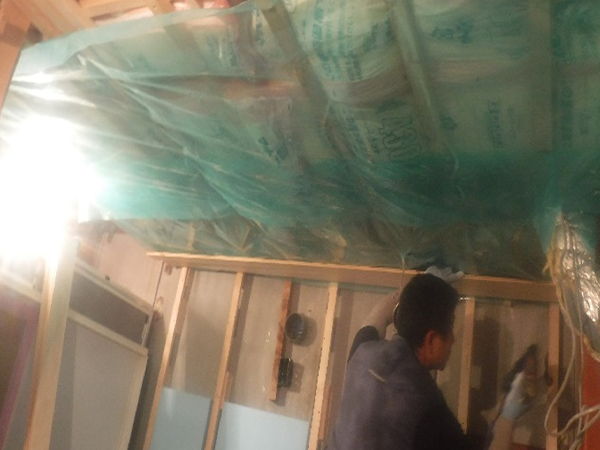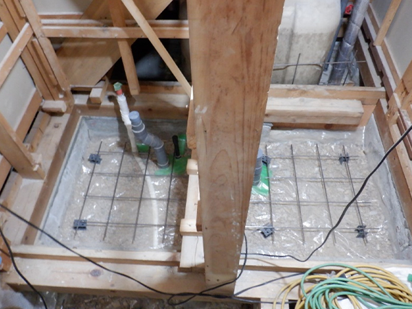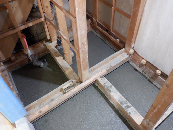 工事内容:腰壁・天井桧羽目板張、床(下地共)撤去、防湿コンクリート、床断熱材、床コルクタイル貼